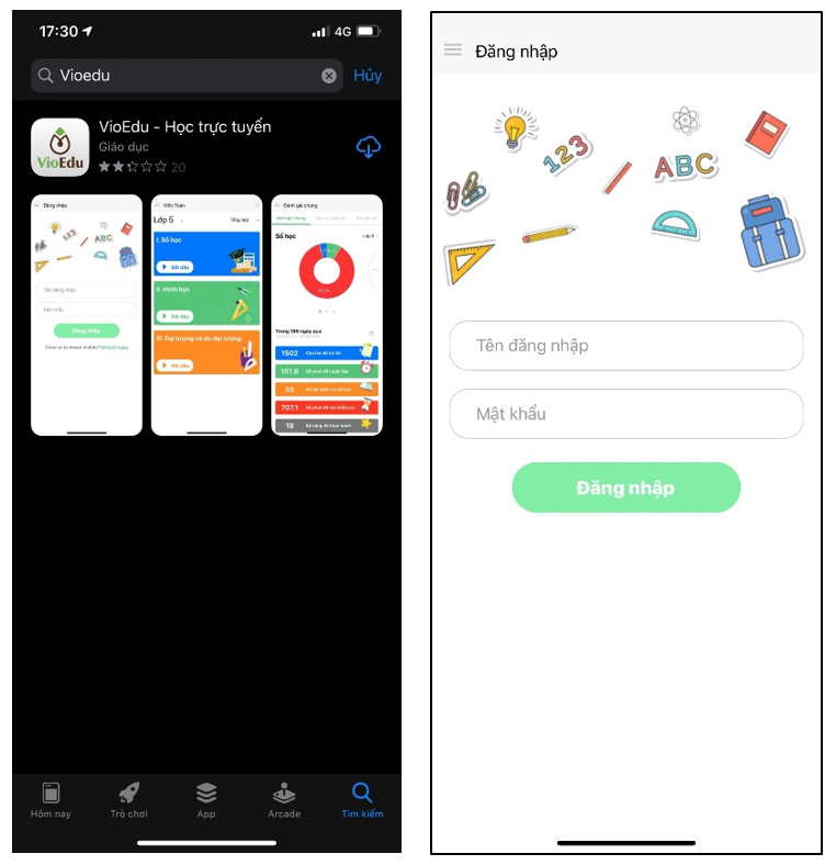 Phụ huynh học sinh tải App trên điện thoại tại Apple Store hoặc Google Play bằng cách search từ khóa “VioEdu”. Đăng nhập và sử dụng.