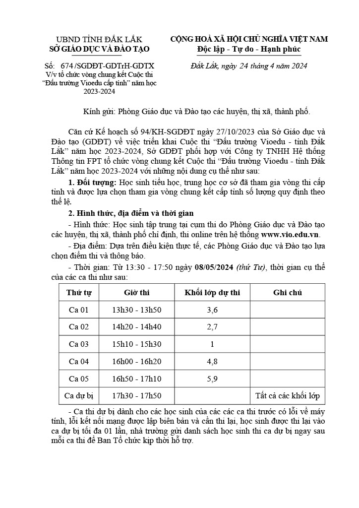 Chung kết Đấu trường VioEdu cấp Tỉnh tại Đắk Lắk sẽ diễn ra vào thứ Tư, ngày 08/05/2024. Học sinh từ khối 1-9 sẽ thi đấu tập trung tại cụm thi do Phòng Giáo dục và Đào tạo các huyện, thị xã, thành phố chỉ định. Tương tự như các vòng đấu trước đó, học sinh làm bài thi online trên hệ thống www.vio.edu.vn với cấu trúc đề bao gồm 30 câu hỏi trong vòng 20 phút.