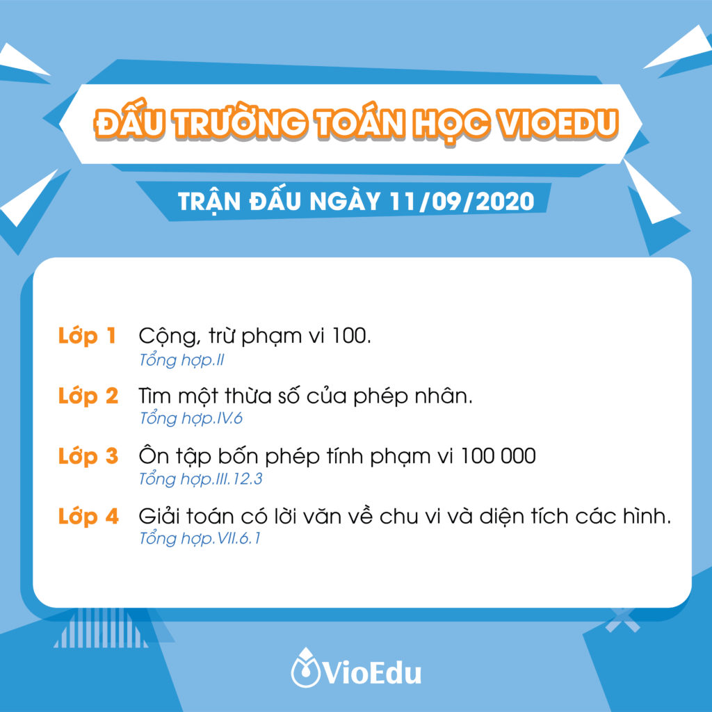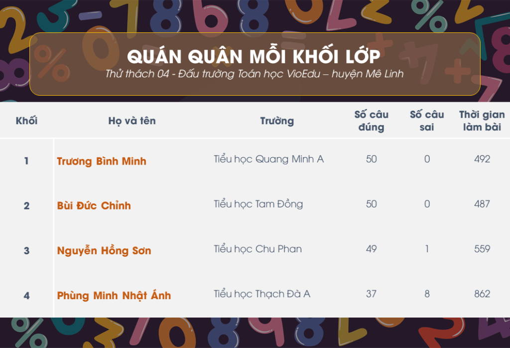 VioEdu công bố kết quả bài thi thử thách 04 – vòng thi online của “Đấu trường Toán học VioEdu huyện Mê Linh” diễn ra 20h00 thứ Sáu ngày 28/08: