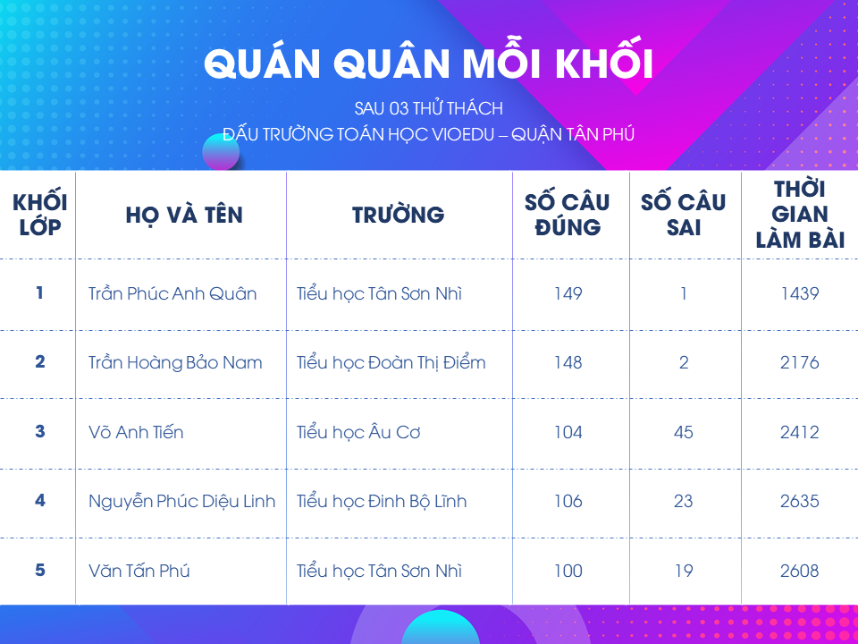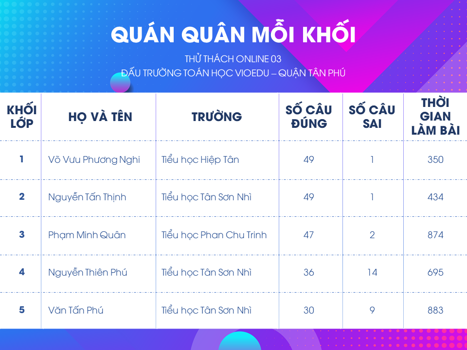 VioEdu công bố kết quả bài thi thử thách 03 – vòng thi online của “Đấu trường Toán học VioEdu quận Tân Phú” diễn ra 20h00 thứ Sáu ngày 28/08: